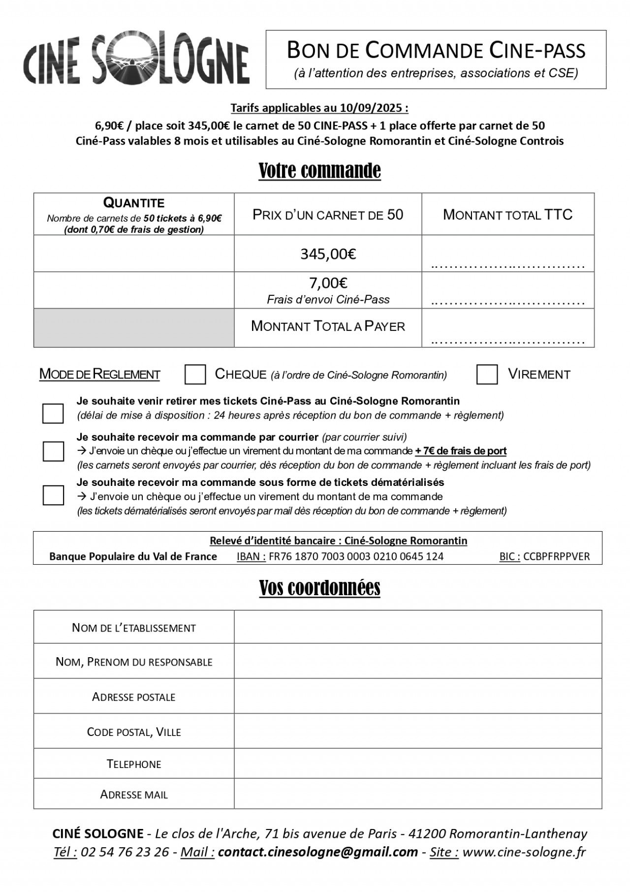 - Utilisables dans nos 2 cinémas Ciné-Sologne Romorantin (5 salles) et Ciné-Sologne Controis (3 salles)